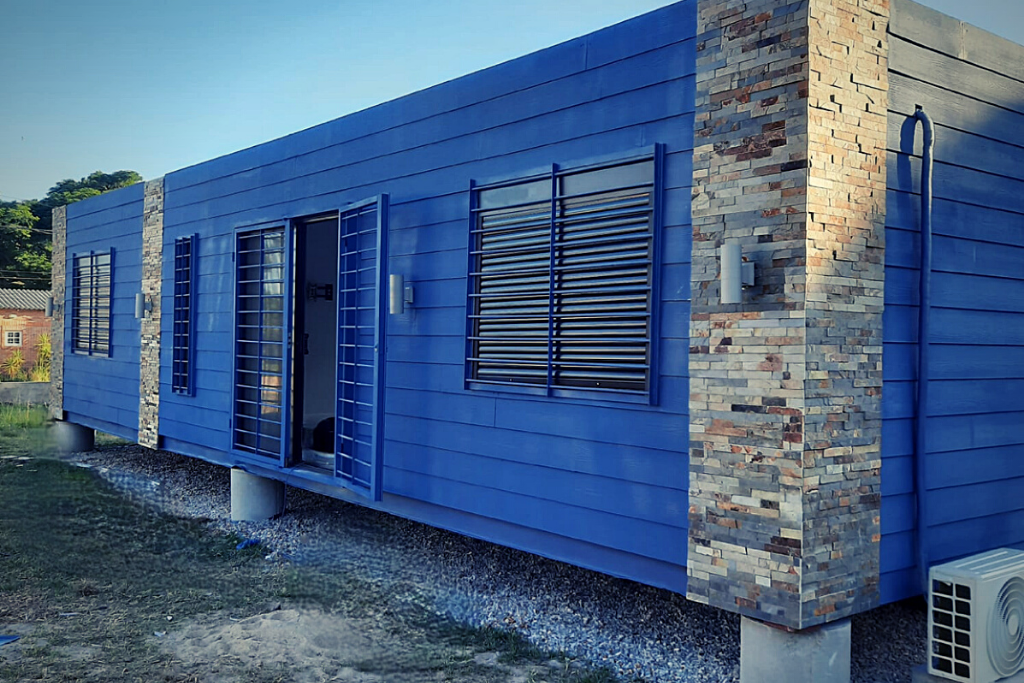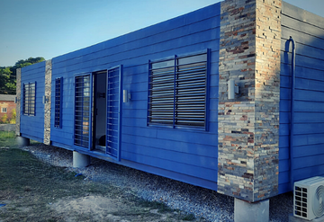 Casa 2 x 40 HC revestida en Siding y detalles en piedra natural