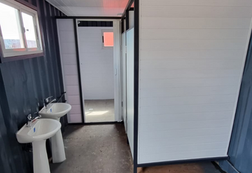Vestuario con 4 duchas, 2 inodoros y 2 lavatorios